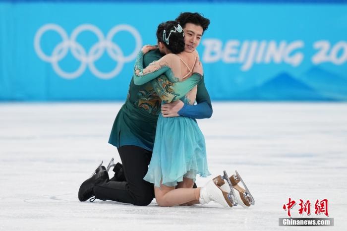 北京冬奧會(huì)花樣滑冰冰上舞蹈自由舞比賽賽后,王詩玥/柳鑫宇跪地相擁。(資料圖)中新社記者 崔楠 攝