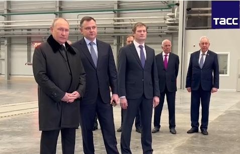 當(dāng)?shù)貢r(shí)間2月21日,俄總統(tǒng)普京視察喀山飛機(jī)制造廠。圖片來源:塔斯社視頻截圖