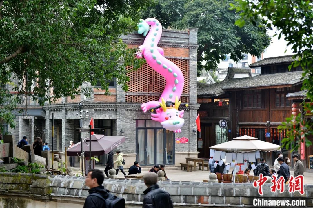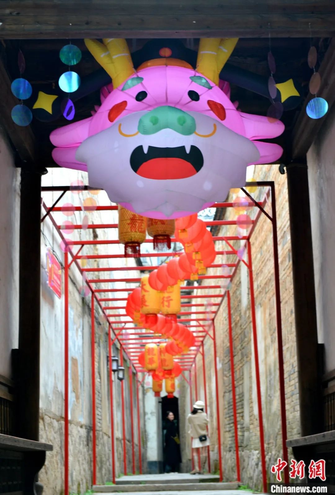“龍元素”藝術主題裝置亮相福州上下杭歷史文化街區(qū),活潑的造型與古厝形成鮮明對比。中新社記者 呂明 攝