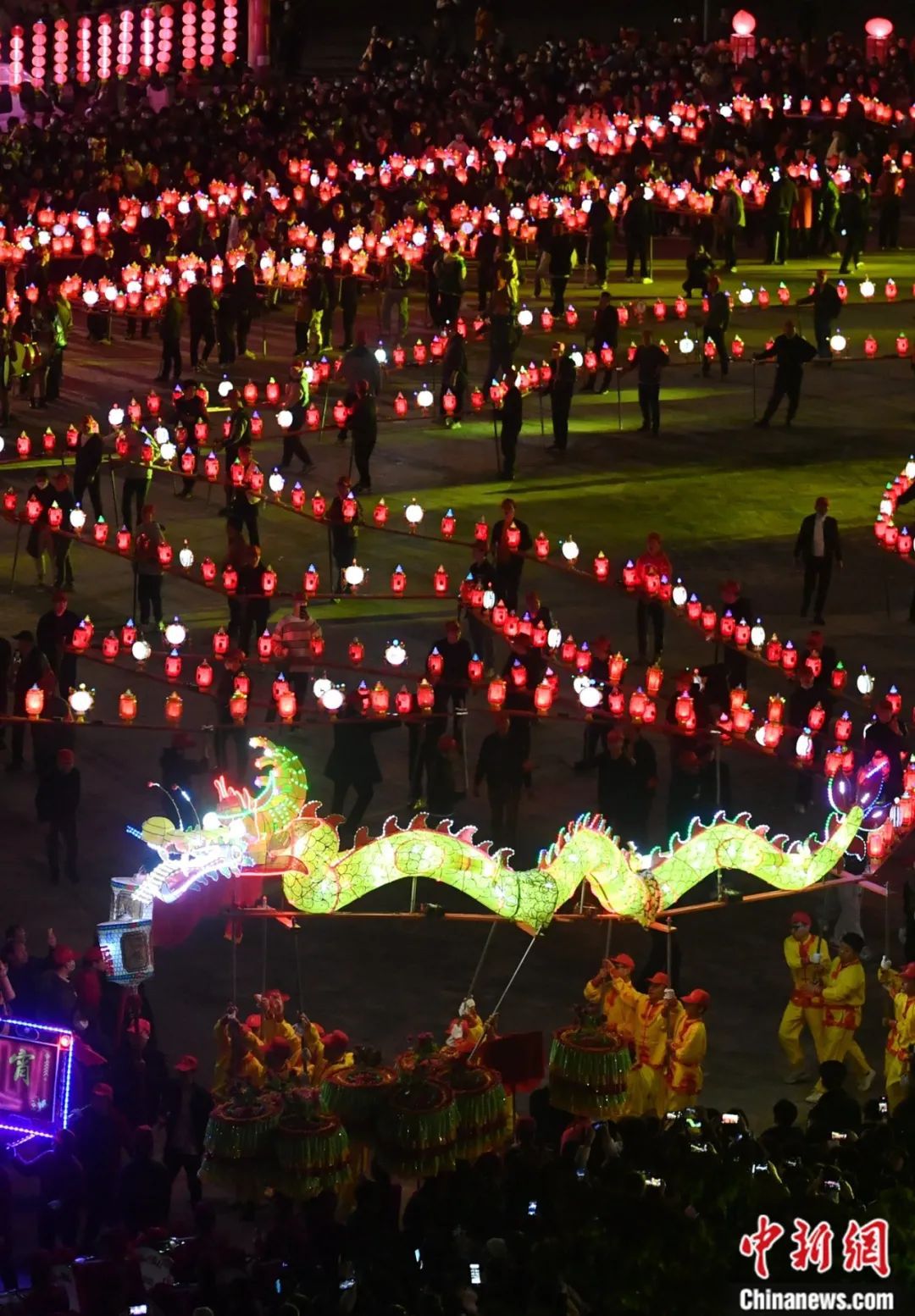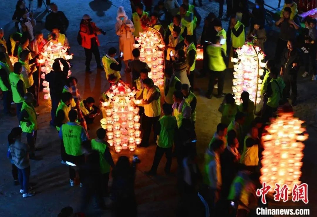 村民們抬著各種造型的燈籠穿行在古村落里。中新社記者 張斌 攝