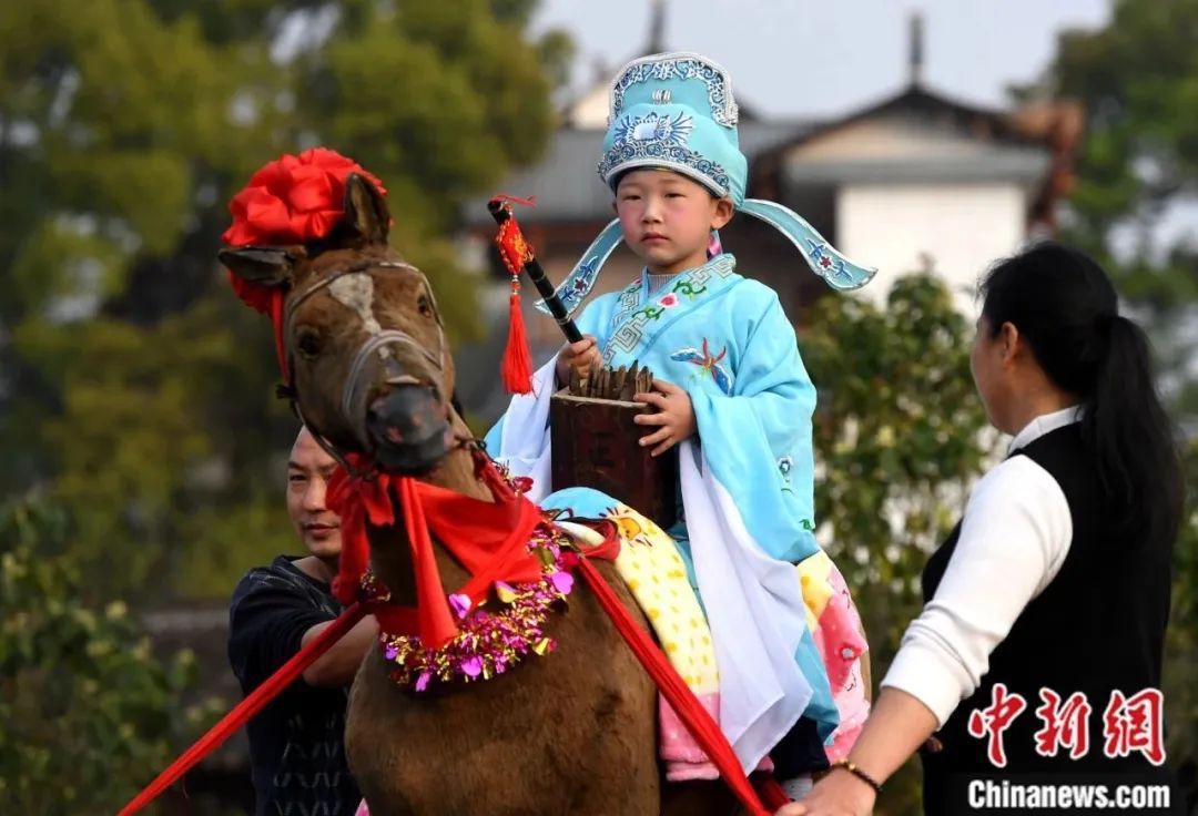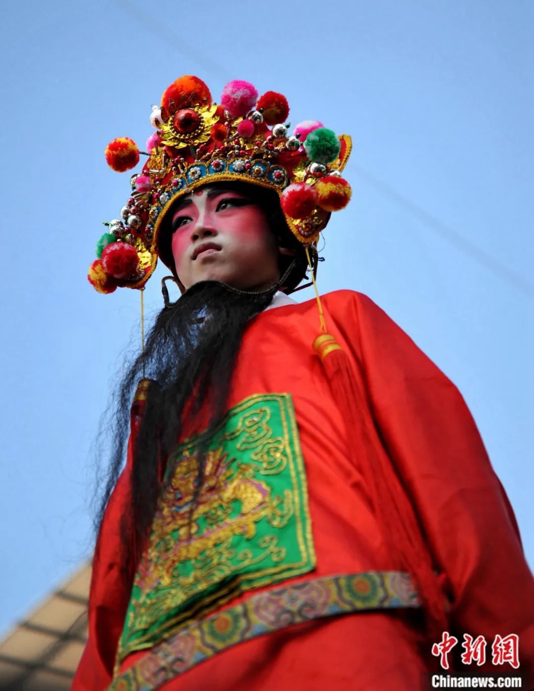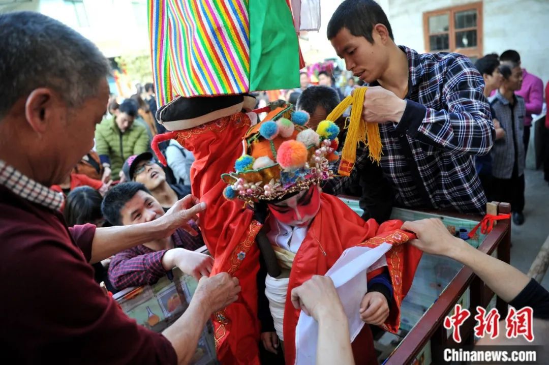 連城縣羅坊鄉(xiāng)舉行國家級非物質文化遺產(chǎn),享有“中國客家狂歡節(jié)”美譽的“走古事”民俗活動。圖為立于轎臺之上參加“走古事”的兒童。中新社記者 張斌 攝