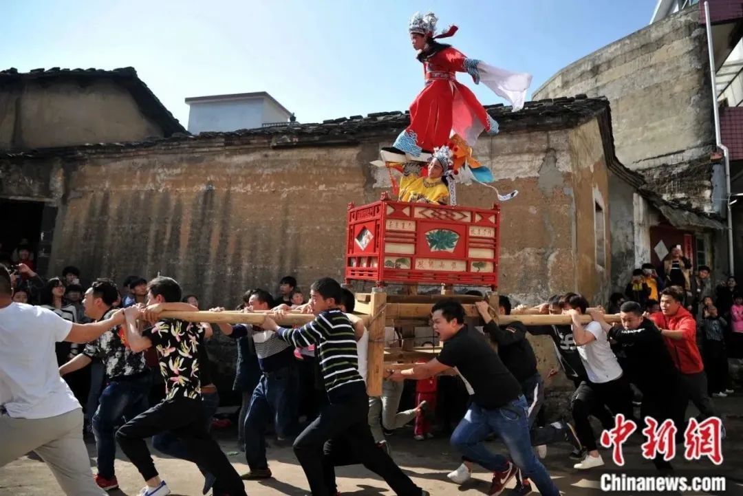 每年正月初十及正月二十六,潭頭鎮(zhèn)厚福村都會舉行傳統(tǒng)游神民俗活動,至今已有400多年的歷史。圖為傳統(tǒng)游神民俗活動中的巡游隊伍簇擁著挺神將的人走街串巷。中新社記者 呂明 攝