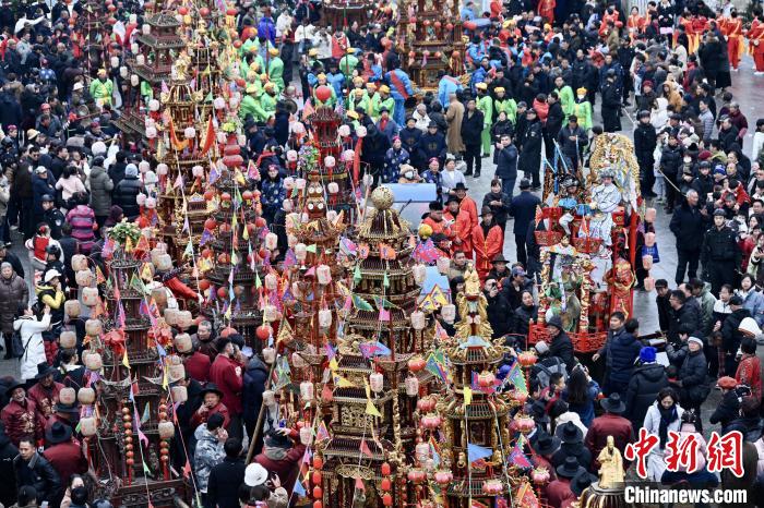 在巡游途中,童氏后人按規(guī)定擺上供品供請(qǐng)祖先,沿路隨處有村民無償供應(yīng)水果、茶點(diǎn)、湯包和麥餃筒給游人享用。游行隊(duì)伍還會(huì)進(jìn)行舞龍舞獅、秧歌舞、“碾后街”等民俗表演,村民、游客擠滿了街巷,熱鬧的鼓樂和喝彩響徹云霄。到了晚上,家家戶戶張燈結(jié)彩,鼓亭抬閣上亮起盞盞花燈,綿延數(shù)里流光溢彩,伴隨著絢爛煙花將氣氛推向高潮。