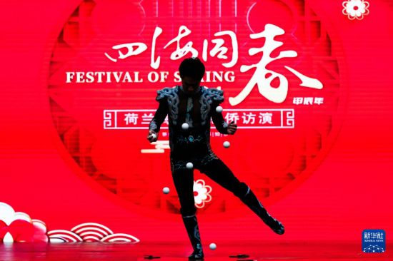 2月24日,演員在荷蘭海牙舉行的“四海同春”慰僑訪演活動上表演雜技。新華社記者 孟鼎博 攝