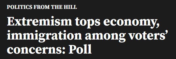 調(diào)查發(fā)現(xiàn),21%的受訪者表示“政治極端主義或者民主所受到的威脅”是他們最為擔(dān)心的問題,其次才是經(jīng)濟(jì)問題和移民問題,后兩者占比分別為19%和18%。
