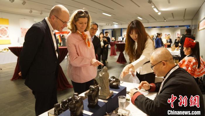 來賓欣賞石雕非遺手工藝。柏林中國(guó)文化中心供圖