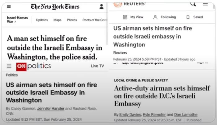 正常一則報(bào)道,標(biāo)題最好是能以最高效的方式聚合“時(shí)間地點(diǎn)人物起因經(jīng)過(guò)結(jié)果”諸要素(因?yàn)槭恰靶侣劇?,時(shí)間要素反而可以選擇弱化),而在西方主流媒體對(duì)這次自焚抗議事件的第一批報(bào)道中,標(biāo)題基本都只有“地點(diǎn)人物結(jié)果”三個(gè)要素,即《某人在以色列使館自焚》這樣的表達(dá),最多會(huì)加一個(gè)“空軍”或“現(xiàn)役空軍”的人物身份。