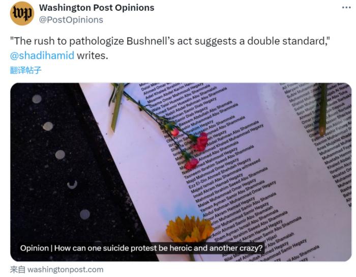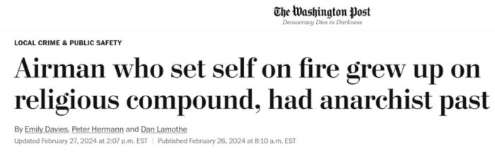 2月25日在以色列駐美大使館門(mén)前自焚身亡以抗議美以在加沙進(jìn)行種族滅絕的25歲現(xiàn)役美空軍亞倫·布什內(nèi)爾,以身證道,成了近期震驚世界的事件。關(guān)于這位義士的生平簡(jiǎn)介、抗議行動(dòng)本身和以后的價(jià)值、意義,這兩天想必各位也聽(tīng)了、看了不少了,今天烏鴉來(lái)談?wù)勥@次自焚抗議事件發(fā)生后,也許更加值得細(xì)品的一些狀況。
