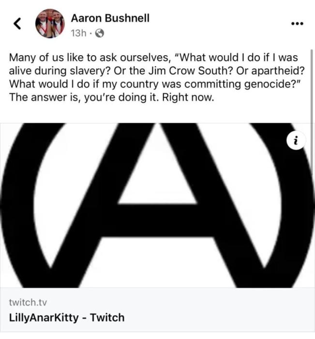 但最近的消息,顯示布什內(nèi)爾可能不是認(rèn)為美國(guó)“間接”幫助以色列種族滅絕,而是直接參與了。這些消息由《紐約郵報(bào)》(注意紐約郵報(bào)是偏右媒體,真實(shí)性自辨)披露,稱(chēng)布什內(nèi)爾的朋友說(shuō)“(布什內(nèi)爾)告訴我,我們?cè)谀切┧淼览镉熊婈?duì),美國(guó)士兵參與了殺戮”,“(情報(bào))出現(xiàn)了美國(guó)軍方參與種族屠殺的情況”。