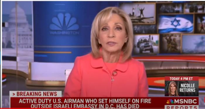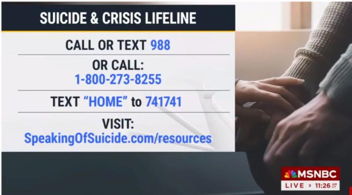 前面還挺正常,就是對(duì)事件的報(bào)道,畫(huà)面也在播報(bào)員和現(xiàn)場(chǎng)鏡頭之前互相切(順帶一提MSNBC的說(shuō)辭也是“抗議哈以戰(zhàn)爭(zhēng)”),然后話(huà)鋒突然一轉(zhuǎn):“如果你發(fā)現(xiàn)有人有心理健康風(fēng)險(xiǎn),請(qǐng)及時(shí)撥打預(yù)防自殺熱線(xiàn)XXXXX……”