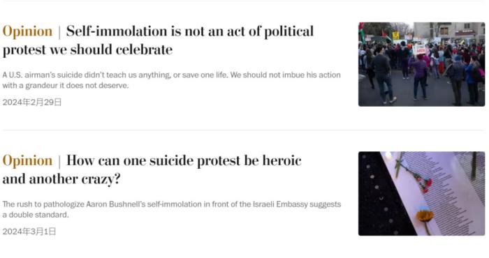 實(shí)際上,因?yàn)椴际矁?nèi)爾在直播中的話(huà)有非常多的政治標(biāo)簽,標(biāo)題想要體現(xiàn)自焚事件的原因本來(lái)是非常容易的。但在西方主流媒體的報(bào)道標(biāo)題中,最能直觀表明布什內(nèi)爾行為原因的三個(gè)關(guān)鍵詞——“加沙”(Gaza)“種族滅絕”(genocide)乃至“抗議”(protest)字樣均未出現(xiàn)。