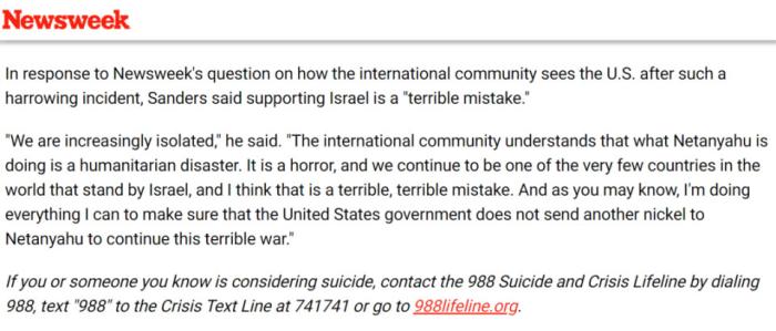 另一家媒體《新聞周刊》,現(xiàn)在則會(huì)在每一篇有關(guān)布什內(nèi)爾的文章文末附上預(yù)防自殺熱線(xiàn)的信息。比如下面這篇文章只是關(guān)于美國(guó)左翼議員伯尼·桑德斯對(duì)布什內(nèi)爾事件的評(píng)論,內(nèi)容跟布什內(nèi)爾本人其實(shí)無(wú)甚關(guān)系,也要附上這么一段……