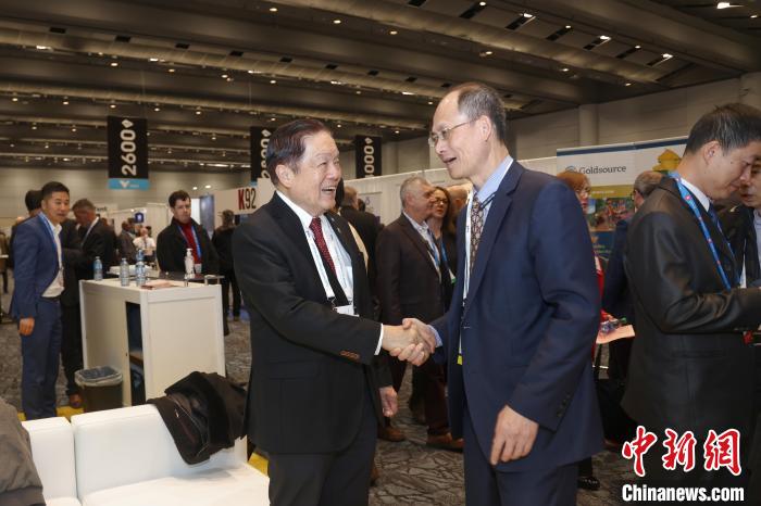 當(dāng)?shù)貢r間3月3日,2024年加拿大國際礦業(yè)大會(PDAC)在多倫多揭幕。圖為加拿大聯(lián)邦參議員胡子修(左)與參展中國企業(yè)紫金礦業(yè)集團股份有限公司副總裁沈紹陽交流。中新社記者 余瑞冬 攝
