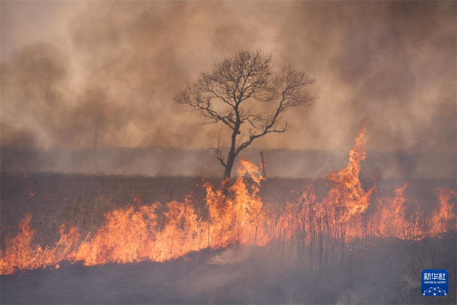這是3月5日在俄羅斯濱海邊疆區(qū)南部拍攝的野火現(xiàn)場。新華社發(fā)(郭飛洲攝)
