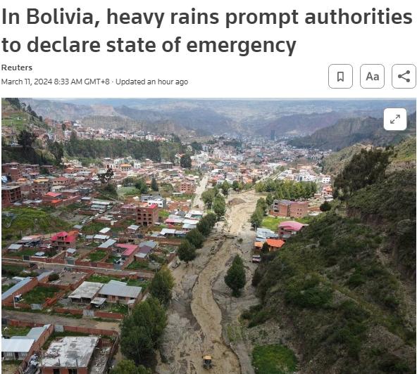 據(jù)報(bào)道,玻利維亞當(dāng)局當(dāng)天在文件中稱(chēng),大雨導(dǎo)致多個(gè)社區(qū)和城市偏遠(yuǎn)地區(qū)發(fā)生洪災(zāi),導(dǎo)致水、電和道路中斷。