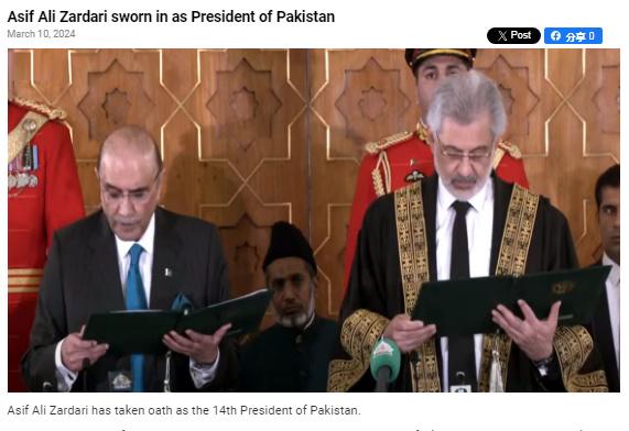 報道稱,扎爾達里曾是“巴基斯坦第一位民選總統(tǒng)”,這次是他第二次當選巴基斯坦總統(tǒng)。