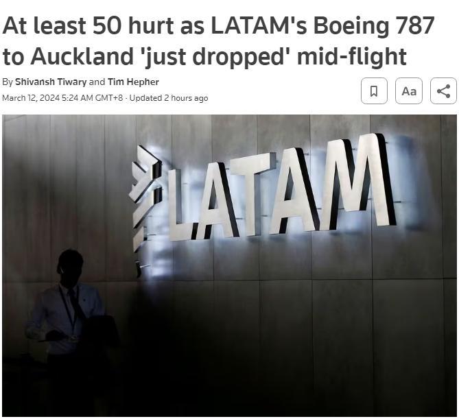 當時, 總部位于智利的拉塔姆航空公司一架從澳大利亞悉尼飛往新西蘭奧克蘭的波音飛機,因技術(shù)問題,在飛行途中急降,“劇烈俯沖”數(shù)秒,導(dǎo)致乘客撞上機艙頂,造成至少50人受傷。