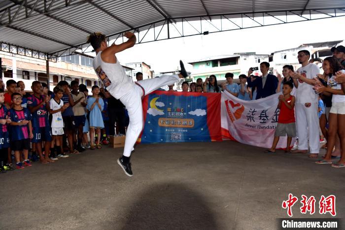 當(dāng)?shù)貢r(shí)間3月23日,巴西里約熱內(nèi)盧石頭河社區(qū),巴西“戰(zhàn)舞”舞者為來自加拿大的華僑華人小朋友表演?!≈行律缬浾?林春茵 攝
