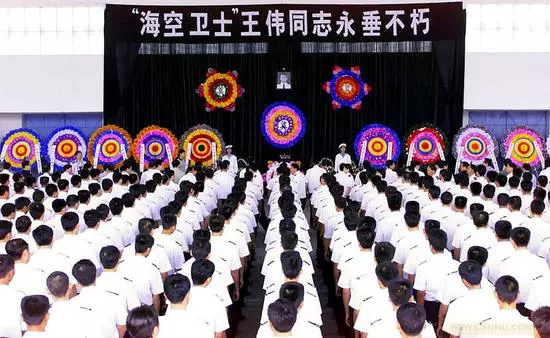 2001年4月26日,海南三亞,海軍舉行海上祭奠“海空衛(wèi)士”王偉烈士活動。