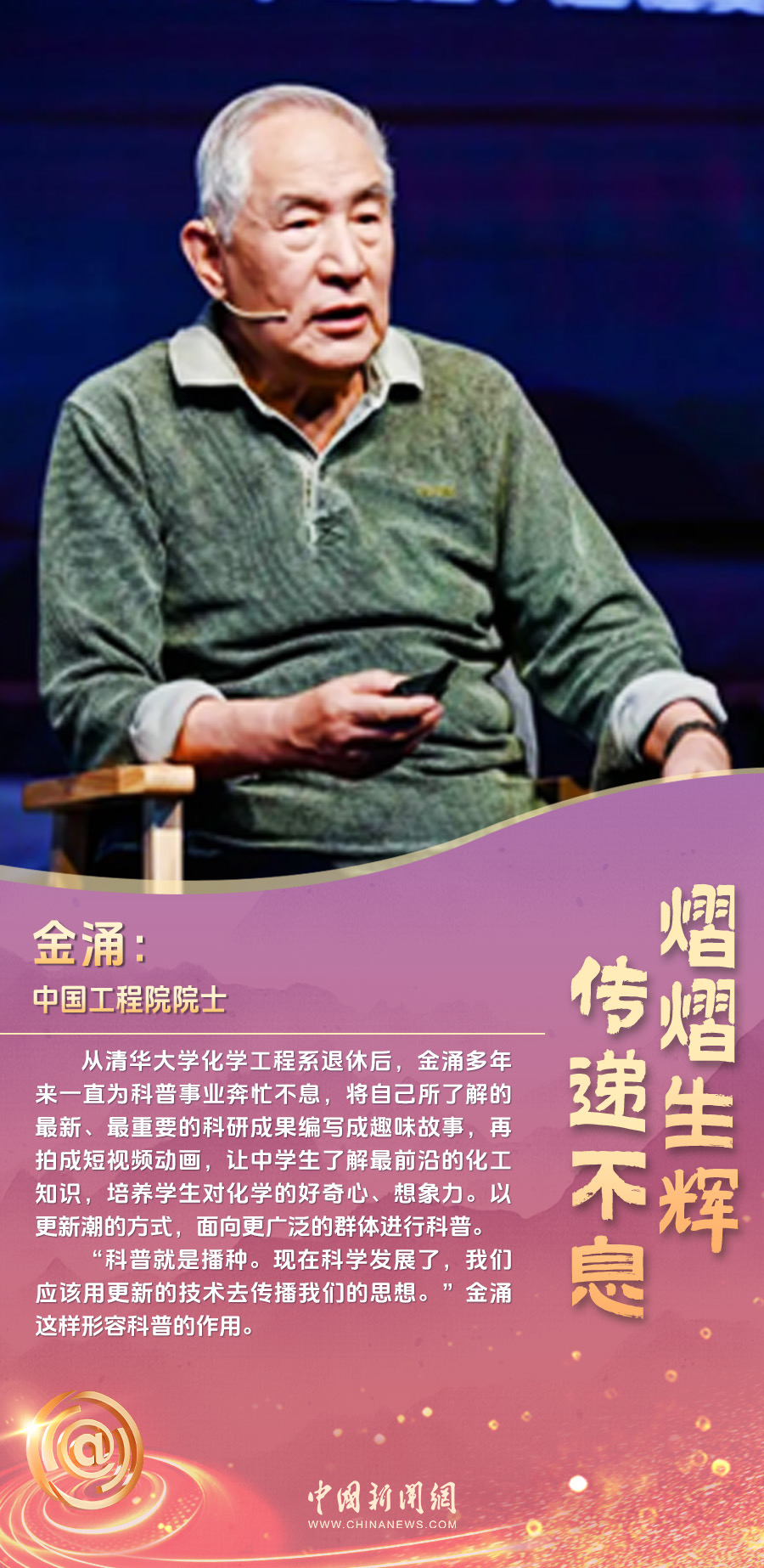 他,用一年時間,冒著嚴寒、頂著酷暑,與居民們深入溝通,解決好社區(qū)的“充電難”問題;她 ,2019年在大學(xué)校園中挺身而出,保護同學(xué),2023年成為了一名人民警察;他,從清華大學(xué)化學(xué)工程系退休后,多年來一直為科普事業(yè)奔忙不息……