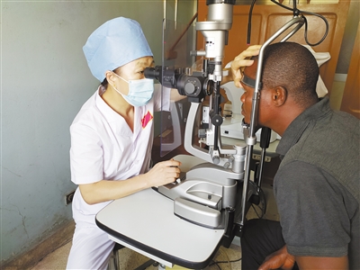 中國專家正在為貝寧當?shù)鼗颊哌M行眼科檢查。