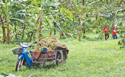 在泰國(guó)南部春蓬府的一家榴蓮種植園,工人將采摘下來(lái)的榴蓮裝到車上準(zhǔn)備運(yùn)出。