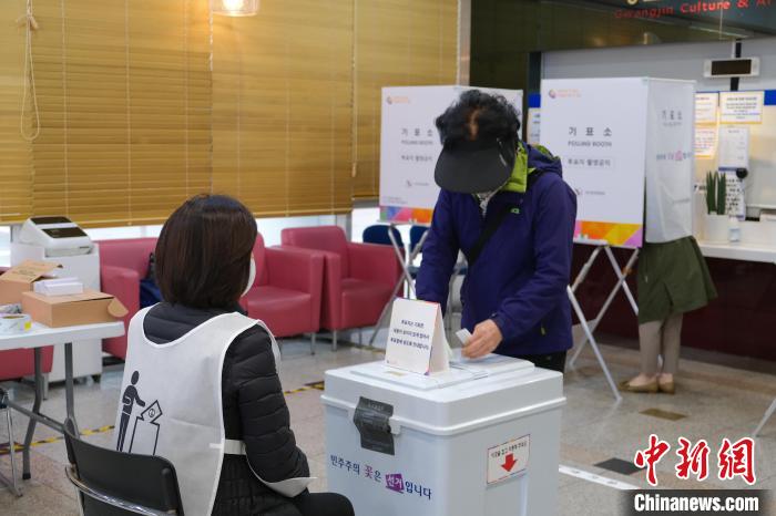 韓國(guó)第22屆國(guó)會(huì)議員選舉4月10日舉行,各政黨候選人將角逐國(guó)會(huì)300個(gè)議席。圖為首爾市廣津區(qū)一處投票站內(nèi),選民將選票投入票箱。中新社記者 劉旭 攝