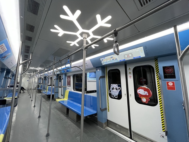 登上車廂,隨處可見(jiàn)冬奧元素。車頂?shù)臒魩Р辉賳握{(diào),而是被設(shè)計(jì)成了雪花的形狀,車廂扶手也融入了冰球桿的設(shè)計(jì)。而在車門(mén)上,北京冬奧會(huì)吉祥物“冰墩墩”和“雪容融”仿佛在和乘客們招手。