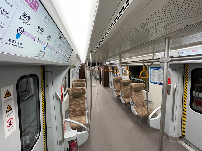走進車廂,記者注意到,車內(nèi)沒有用來隔絕駕駛室與客室的間壁門,而是采用開放式駕駛室,乘客可在保證安全的情況下更直觀地感受駕駛員的視角。此外,考慮到接駁大興機場線大件行李旅客的需求,“虎鯨號”列車設計2節(jié)“特別”車廂,車廂內(nèi)設置左右兩邊單列單座的高鐵同款座椅,乘客可將大件行李放在座位側(cè)邊,避免車廂內(nèi)擁擠。
