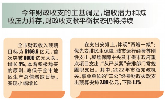在財政收支依然嚴峻的情況下,“緊平衡”態(tài)勢也呈現(xiàn)出與以往財政收入零增長、負增長不同的態(tài)勢。吳素芳介紹,2022年的“緊平衡”,主要體現(xiàn)為收入回歸常態(tài)運行,但各領(lǐng)域資金需求快速增長。財政部門要堅決貫徹落實中央經(jīng)濟工作會提出的“積極的財政政策要提升效能,更加注重精準(zhǔn)、可持續(xù)”工作要求,通過調(diào)結(jié)構(gòu)、盤存量、抓統(tǒng)籌、保重點等方式做好保障。在支出安排上,體現(xiàn)“兩增一減”:優(yōu)先安排民生保障、城市運行經(jīng)費等剛性支出,聚焦保障中央及市委市政府重點項目支出,“從嚴從緊”安排部門常規(guī)履職支出。其中,2022年市級黨政機關(guān)、事業(yè)單位的“三公”經(jīng)費財政撥款支出預(yù)算安排7.09億元,下降1.1%。