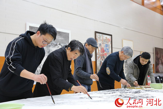 人民網(wǎng)石家莊1月6日電 由“為奧運喝彩”組委會主辦的“百名畫家繪冬奧”活動5日走進河北。河北省20余名當(dāng)?shù)厮囆g(shù)家現(xiàn)場揮毫潑墨,合作創(chuàng)作了三幅奧林匹克題材的中國畫作,喜迎即將到來的冰雪盛會。