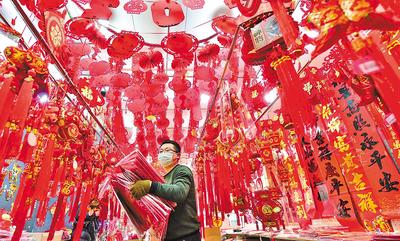1月8日,石家莊市南三條市場的商戶在忙著準備年貨。隨著農(nóng)歷新年的臨近,春聯(lián)、福字、燈籠、虎年生肖飾品的銷售行情逐日升溫。 河北日報通訊員 張曉峰攝