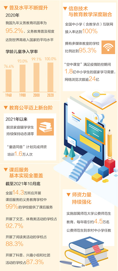 黨的十八大以來,在以習(xí)近平同志為核心的黨中央堅(jiān)強(qiáng)領(lǐng)導(dǎo)下,我國義務(wù)教育取得了舉世矚目的成就:2020年,我國九年義務(wù)教育鞏固率為95.2%,義務(wù)教育普及程度達(dá)到世界高收入國家的平均水平;實(shí)施義務(wù)教育薄弱環(huán)節(jié)改善和能力提升項(xiàng)目,發(fā)展“互聯(lián)網(wǎng)+”教育助力城鄉(xiāng)教育均衡,全國義務(wù)教育基本均衡已經(jīng)全面實(shí)現(xiàn)……讓適齡兒童少年有學(xué)上、上好學(xué),讓每個(gè)孩子都能享有公平而有質(zhì)量的教育,正在成為現(xiàn)實(shí)。