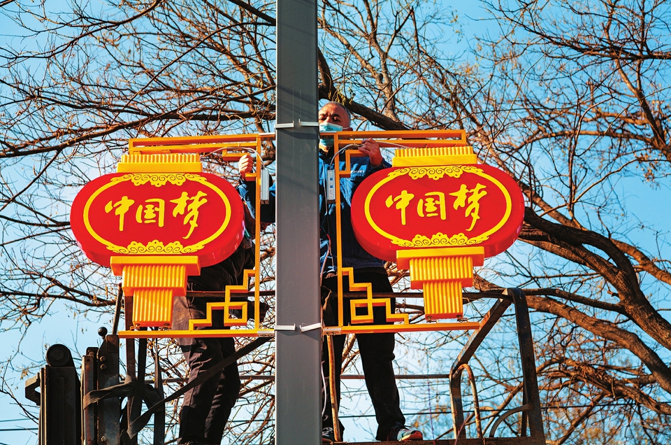 1月11日,工作人員在運城市鹽湖區(qū)紅旗街上安裝花燈。臨近春節(jié),運城市城市管理局組織人力在市區(qū)主要街道裝置迎新花燈,花燈有燈籠、中國結、鞭炮等多種造型,扮靚了城市,也營造出歡樂、祥和、喜慶的節(jié)日氛圍。(茹雅攝)