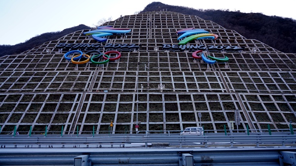 京禮高速沿線護(hù)坡布置冬奧會、冬殘奧會會徽標(biāo)志景觀。