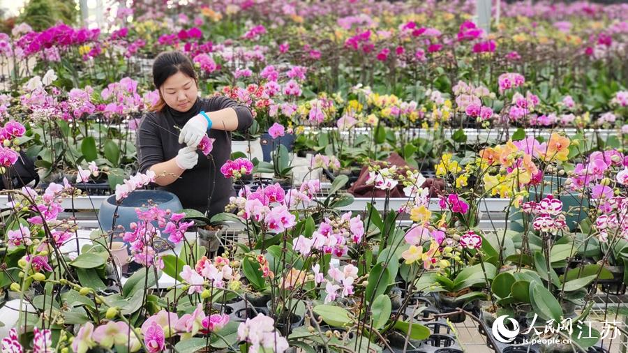 基地員工忙著對蝴蝶蘭進行組盆。丁華明攝人民網宿遷1月13日電 (黃啟源)臨近春節(jié),江蘇沭陽縣耿圩鎮(zhèn)的蝴蝶蘭基地里百花爭妍,恰似彩蝶起舞。作為當?shù)靥m花產業(yè)化示范園區(qū),這里培植有60余個蘭花品種,目前年實現(xiàn)產值過億元?;啬昀塾嬘霉?00余人,其中相當一部分是當?shù)氐褪杖霊?,可為每人每年增加工資性收入4萬余元。