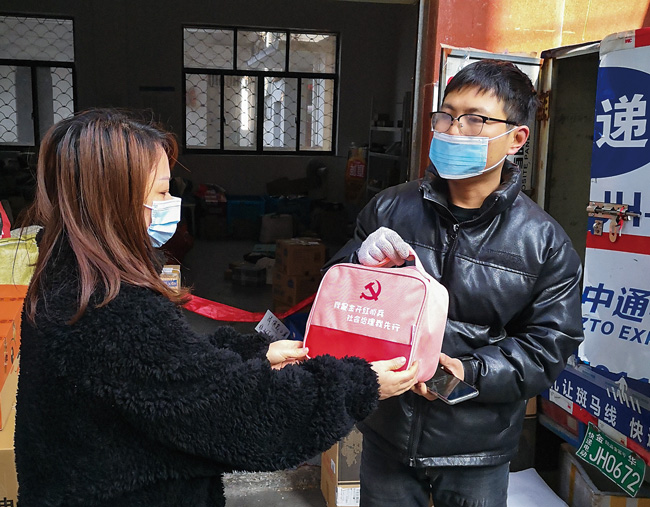 1月12日,金華開發(fā)區(qū)江南街道金錢寺社區(qū)給快遞小哥贈送裝有口罩、酒精、消毒液等物資的“防疫禮包”,讓快遞小哥做好自身防護。(時寬兵)