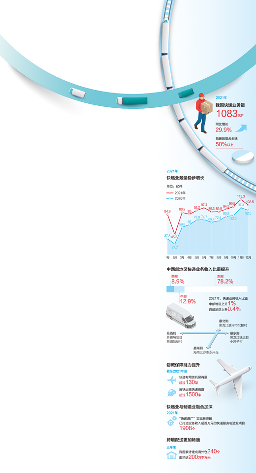 快遞業(yè)既貫通生產(chǎn)、分配、流通、消費各環(huán)節(jié),又關(guān)聯(lián)一二三各產(chǎn)業(yè)。2021年,我國快遞業(yè)務(wù)量達1083億件,同比增長29.9%??爝f業(yè)蓬勃發(fā)展,不僅有利于制造業(yè)通過兩業(yè)融合實現(xiàn)降本增效,更在走出去的步伐中助力“國貨出?!?,支撐跨境商品流動更便利,為行業(yè)內(nèi)外帶來更多機遇。