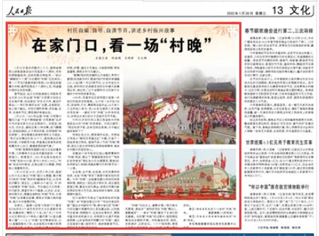 1月25日至26日,農歷小年之際,國家公共文化云推出“村晚”接力云展播,集中展示《我的“村晚”我的年》融媒體節(jié)目,以及來自內蒙古、黑龍江、上海等20個省(區(qū)、市)的30場精彩“村晚”活動。節(jié)目通過文化傳承、時代新風、展望未來3個篇章,以訪談、互動、游戲等方式,展播各地特色“村晚”節(jié)目、分享“村晚”臺前幕后故事、展現(xiàn)鄉(xiāng)村振興美好畫卷、推介鄉(xiāng)村美景好物。