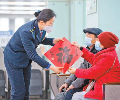 春運期間,南京火車站從細節(jié)著手、小事出發(fā),推出了一系列溫馨服務。“158”雷鋒服務站購置一批適合兒童使用的口罩,教孩子們如何正確佩戴,同時為乘車旅客送上春聯(lián)、窗花或“福”字。圖為“158”雷鋒服務站客運值班員為旅客送上新春祝福。