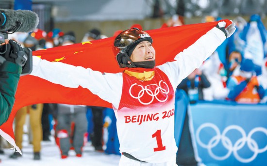北京冬奧會(huì)自由式滑雪女子空中技巧決賽最終輪一跳定勝負(fù),中國隊(duì)徐夢(mèng)桃奪得金牌。 本報(bào)記者 潘之望攝