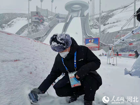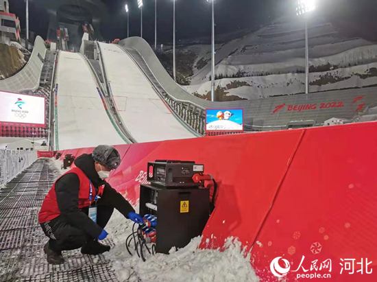 國家跳臺滑雪中心電力保障團(tuán)隊在賽事后檢查用電設(shè)備。 韓寶喜攝