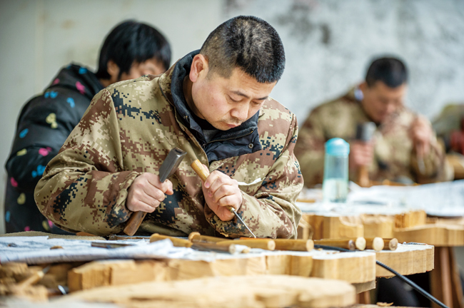 2月16日,金華東陽(yáng)市一木雕工坊里,工匠在專心制作大型木雕作品。春節(jié)過(guò)后,東陽(yáng)木雕企業(yè)紛紛開(kāi)工生產(chǎn)趕訂單。(胡肖飛)