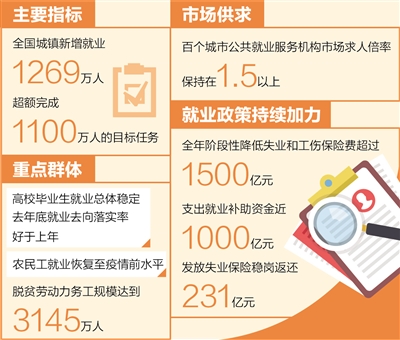 看主要指標,全國城鎮(zhèn)新增就業(yè)1269萬人,超額完成1100萬人的目標任務;全年全國城鎮(zhèn)調(diào)查失業(yè)率平均值為5.1%,比上年平均值下降0.5個百分點,就業(yè)目標任務圓滿完成。