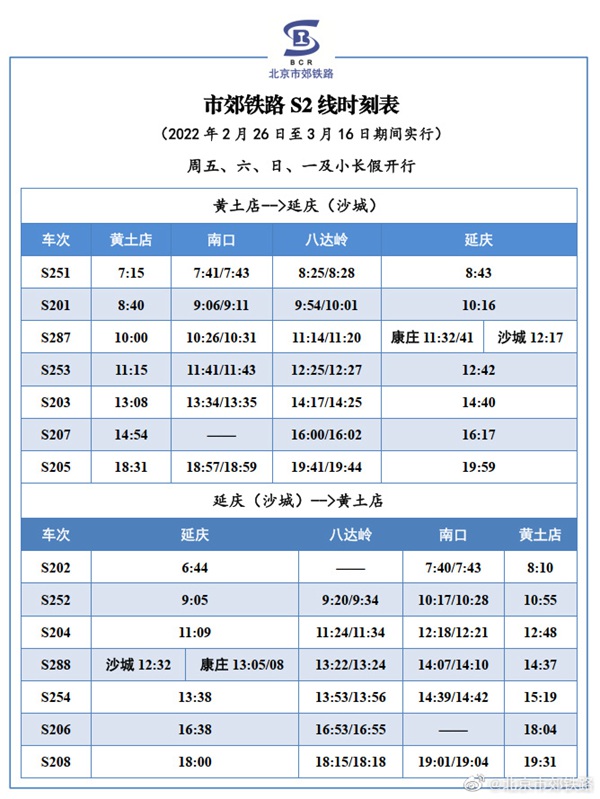 人民網(wǎng)北京2月25日電 據(jù)北京市郊鐵路官方微博消息,根據(jù)鐵路運(yùn)輸調(diào)整通知,2022年2月26日至3月16日, S2線恢復(fù)周二、三、四3對(duì)/日,周五、六、日、一及小長假7對(duì)/日的列車開行方案,列車開行時(shí)點(diǎn)無變化,具體列車時(shí)刻表如下所示。