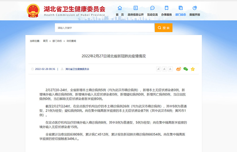 截至2月27日24時(shí),在定點(diǎn)醫(yī)療機(jī)構(gòu)治療的本土確診病例26例(均為武漢市確診病例),其中5例為普通型,21例為輕型;疑似病例0例。尚在集中隔離醫(yī)學(xué)觀察的本土無(wú)癥狀感染者7例(其中武漢市6例;黃岡市1例)。