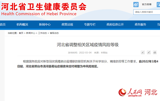 人民網(wǎng)石家莊3月4日電 據(jù)河北省衛(wèi)健委發(fā)布的最新消息,根據(jù)國(guó)務(wù)院應(yīng)對(duì)新型冠狀病毒肺炎疫情聯(lián)防聯(lián)控機(jī)制關(guān)于科學(xué)劃分、精準(zhǔn)防控等工作要求,自2022年3月4日起,河北省將邢臺(tái)市清河縣葛仙莊鎮(zhèn)袁宋莊村調(diào)整為中風(fēng)險(xiǎn)地區(qū)。