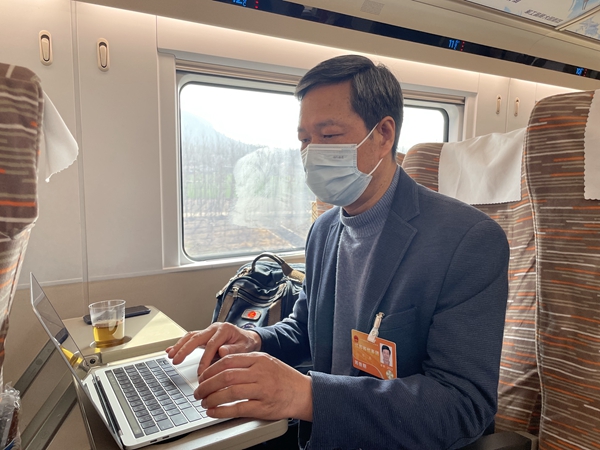赴京參會途中,全國人大代表、南京市第一醫(yī)院副院長陳鑫抓緊時間修改建議。鹿偉攝