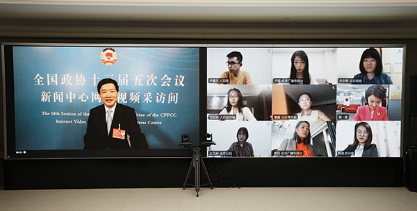 北京市政協(xié)主席魏小東通過(guò)云平臺(tái)接受集體采訪。(北京市政協(xié)供圖)