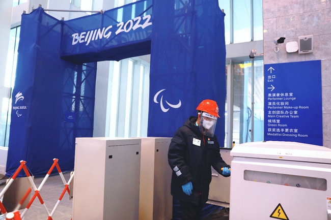 國網(wǎng)北京頒獎廣場電力保障團(tuán)隊(duì)成員在延慶冬殘奧頒獎廣場巡視舞臺區(qū)設(shè)備,確保頒獎儀式供電可靠。張博寧攝